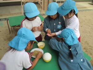 空いた時間にお米の皮をみんなで手分けしてとりました。