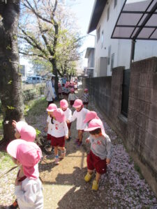 桜並木に着くと、落ちている花びらを
