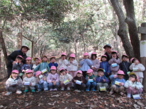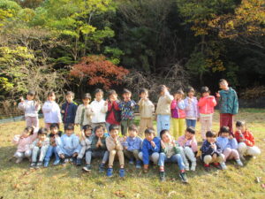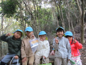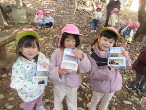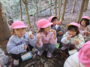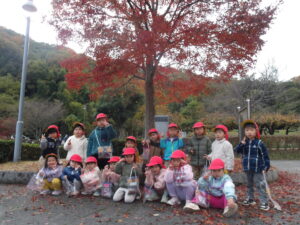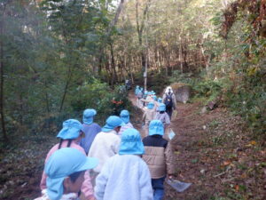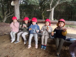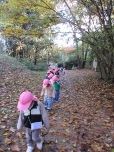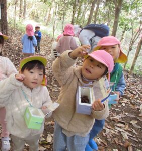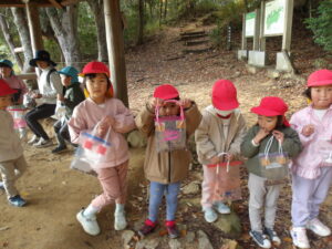 山に入ると早速どんぐりがちらほら!「どんぐりあった!」「みて!どんぐりのぼうしだけある!」「はーとのはっぱあるよ!」と楽しそうに話す子どもたち✨