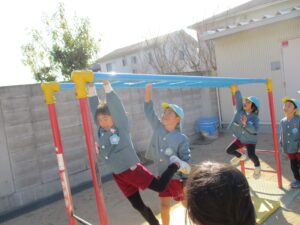 帽子を被って外へ移動し、ドッチボールをしたり、遊具で遊んだりしました。