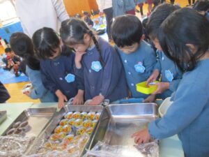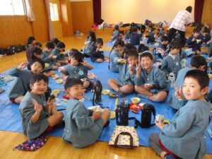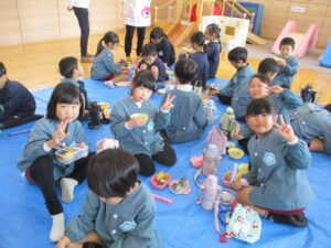 お家の人に作ってもらったおにぎりと豚汁を、なのはなこども園のお友だちと一緒に食べました。