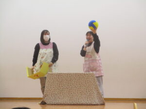 「何が落ちたかな?」と聞くと「ボール!!」「ボールが落ちた!」子ども達は大盛り上がり😊