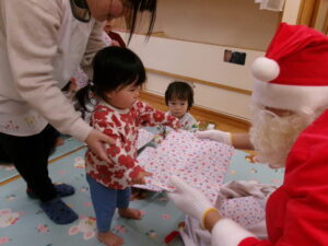 大きな袋からプレゼントが見えると笑顔になり、自分でもらいにいけるお友だちもいました🎁