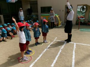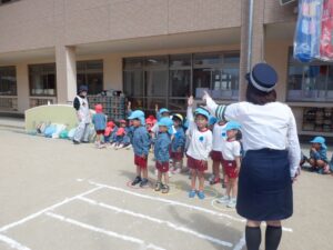 の三つの約束を教えていただき、園庭で横断歩道を渡る練習をしました。