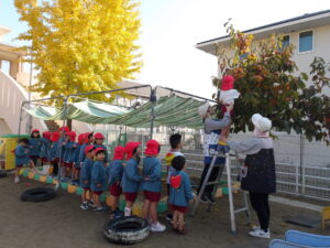 園庭の滑り台の近くにある柿の木に、柿の実ができ始めてから興味津々だった子どもたち!