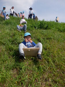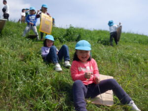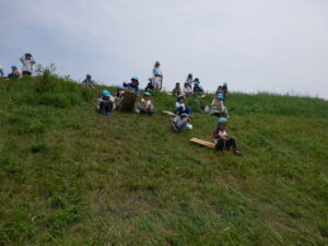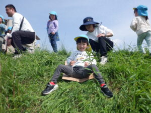 土手に着いてお茶休憩をしたら、早速坂すべり開始!!