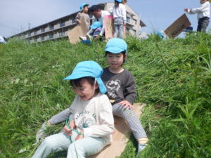 最初は「すすまんー💦」と苦戦していた子どもたちも何度も滑るうちに上手になり、「ここすべりやすいよ!」と話しながら楽しんでいました💓