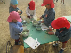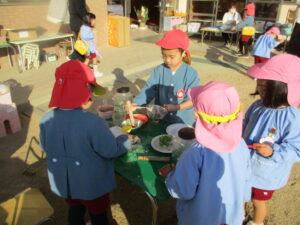 給食室からお野菜を調達するところから始まり、子どもたちは人参の皮をすりおろしたり大根を切ったりして先生やお友だちにごちそうをふるまってくれます🩷