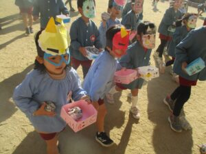 自分たちで作った鬼のお面をかぶってやる気満々な子どもたち👌