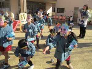自分たちで作った鬼のお面をかぶってやる気満々な子どもたち👌