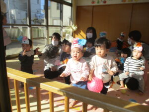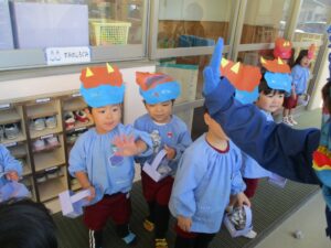 鬼が怖くてお友だちの後ろに隠れたり、先生と一緒に豆まきをしたり、