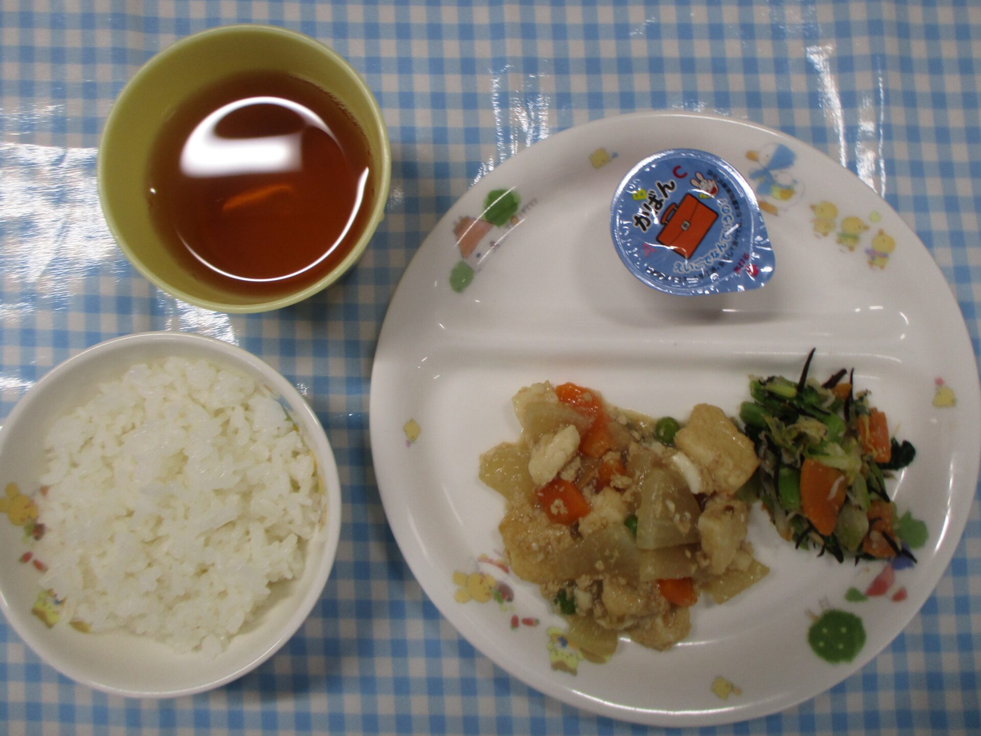 ★今日の献立★ ・ごはん ・厚揚げと大根のそぼろ煮 ・キャベツとひじきの和え物 ・ゼリー ★3時のおやつ★ ・小魚の甘辛 ・お菓子